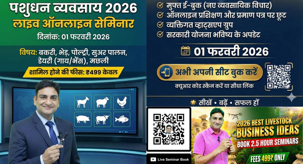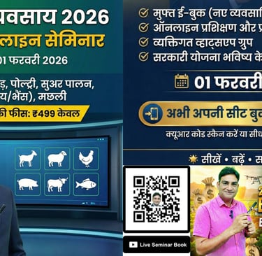 आपको सूचित करते हुए हमें खुशी हो रही है कि एक अनोखा ऑनलाइन पशुपालन सेमीनार 01 फरवरी 2026 को शाम 07:00 बजे आयोजित किया जाएगा। यह सेमीनार केवल 3 घंटे का होगा और इस दौरान आपको भेड़, बकरी, मुर्गी, पिग, डेरी, मछली और झींगा पालन के व्यवसायों की सम्पूर्ण जानकारी प्रदान की जाएगी।